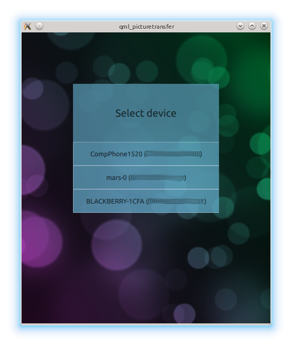 The device discovery uses the BluetoothDiscoveryModel to detect the remote devices. Each discovery is displayed as an entry in a list. Once a device was selected the device address is stored in the root element. More details about the root element will follow further below.