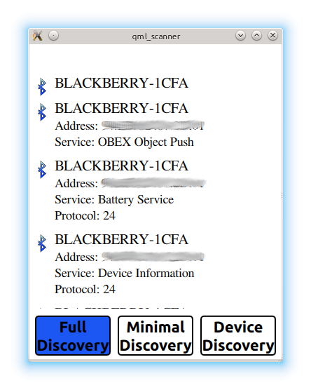 The second and third type of scan dicover the types of services offered by each remote device. A full service discovery can take quite some time to finish. The local device connects to each remote device and performs an SDP enquiry. The results of such an enquiry can be seen below.