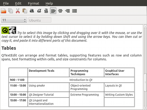 The Text Editor Example presents a sample HTML file using the TextArea control, preserving the HTML formatting. It uses a C++ class to handle the document by providing options to open, format, and edit. The app also lets you open and edit a plain text files.