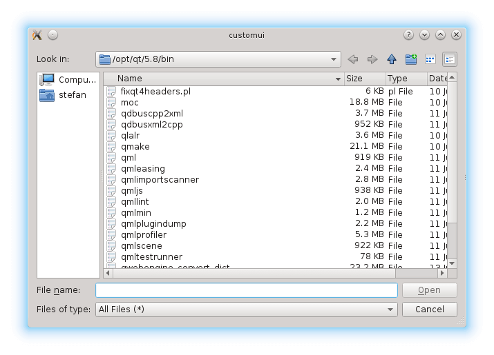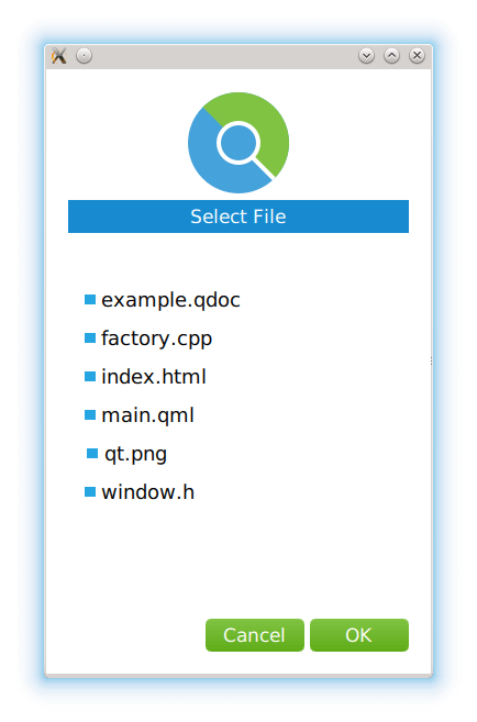 On component completion, we create callbacks for selecting files. When the user selects a file and clicks OK, we pass the selected file to the dialogAccept method.