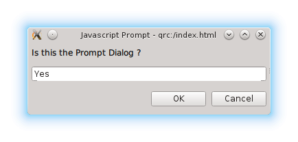 JavaScriptForm { property QtObject request signal closeForm() cancelButton.onClicked: { request.dialogReject(); closeForm(); } okButton.onClicked: { request.dialogAccept(prompt.text); closeForm(); } Component.onCompleted: { switch (request.type) { case JavaScriptDialogRequest.DialogTypeAlert: cancelButton.visible = false; title = qsTr("Alert"); message = request.message; prompt.text = ""; prompt.visible = false; break; case JavaScriptDialogRequest.DialogTypeConfirm: title = qsTr("Confirm"); message = request.message; prompt.text = ""; prompt.visible = false; break; case JavaScriptDialogRequest.DialogTypePrompt: title = qsTr("Prompt"); message = request.message; prompt.text = request.defaultText; prompt.visible = true; break; } } }