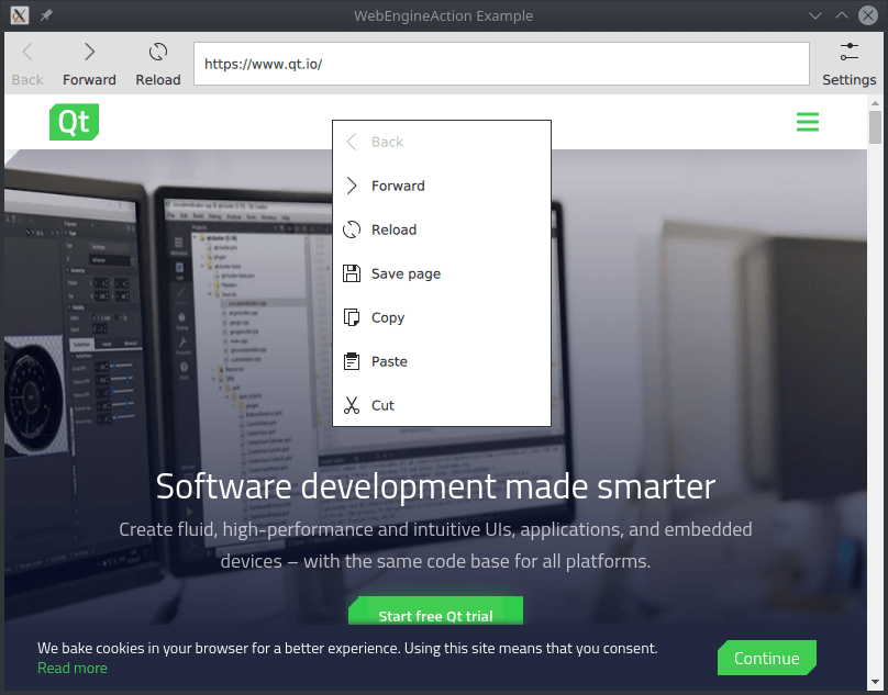 Assigning a WebEngineAction to multiple UI elements will keep them in sync. As it can be seen in the picture above, if the browser engine disables a navigation action, both corresponding menu items will be disabled.