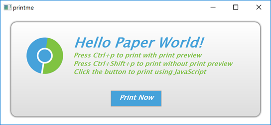 In this example, we create an internal HTML page that is added as a resource collection file (.qrc). The page shows only a small HTML message box that explains how to trigger printing by using keyboard shortcuts or clicking a button. The button has the JavaScript onclick event attribute that calls the JavaScript window.print() function.