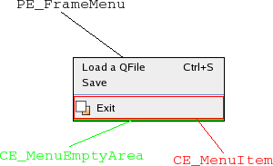 It is also usual to use PE_IndicatorCheckBox (instead of using PE_IndicatorMenuCheckMark) and PE_IndicatorRadioButton for drawing checkable menu items; we have not included them in the style tree as this is optional and varies from style to style.