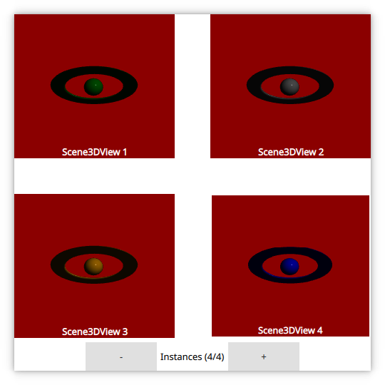 Then we instanciate our Scene3DView instances and make them reference the Scene3D. We also provide a root Entity for each Scene3DView with a scene3dview/AnimatedEntity.qml.