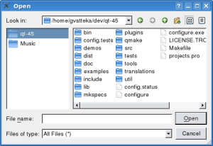 | QFileDialog(QWidget * parent = 0, const QString & caption = QString(), const QString & directory = QString(), const QString & filter = QString()) | |