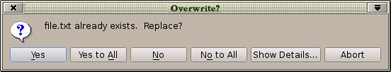 import QtQuick 2.2 import QtQuick.Dialogs 1.1 MessageDialog { title: "Overwrite?" icon: StandardIcon.Question text: "file.txt already exists. Replace?" detailedText: "To replace a file means that its existing contents will be lost. " + "The file that you are copying now will be copied over it instead." standardButtons: StandardButton.Yes | StandardButton.YesToAll | StandardButton.No | StandardButton.NoToAll | StandardButton.Abort Component.onCompleted: visible = true onYes: console.log("copied") onNo: console.log("didn't copy") onRejected: console.log("aborted") }