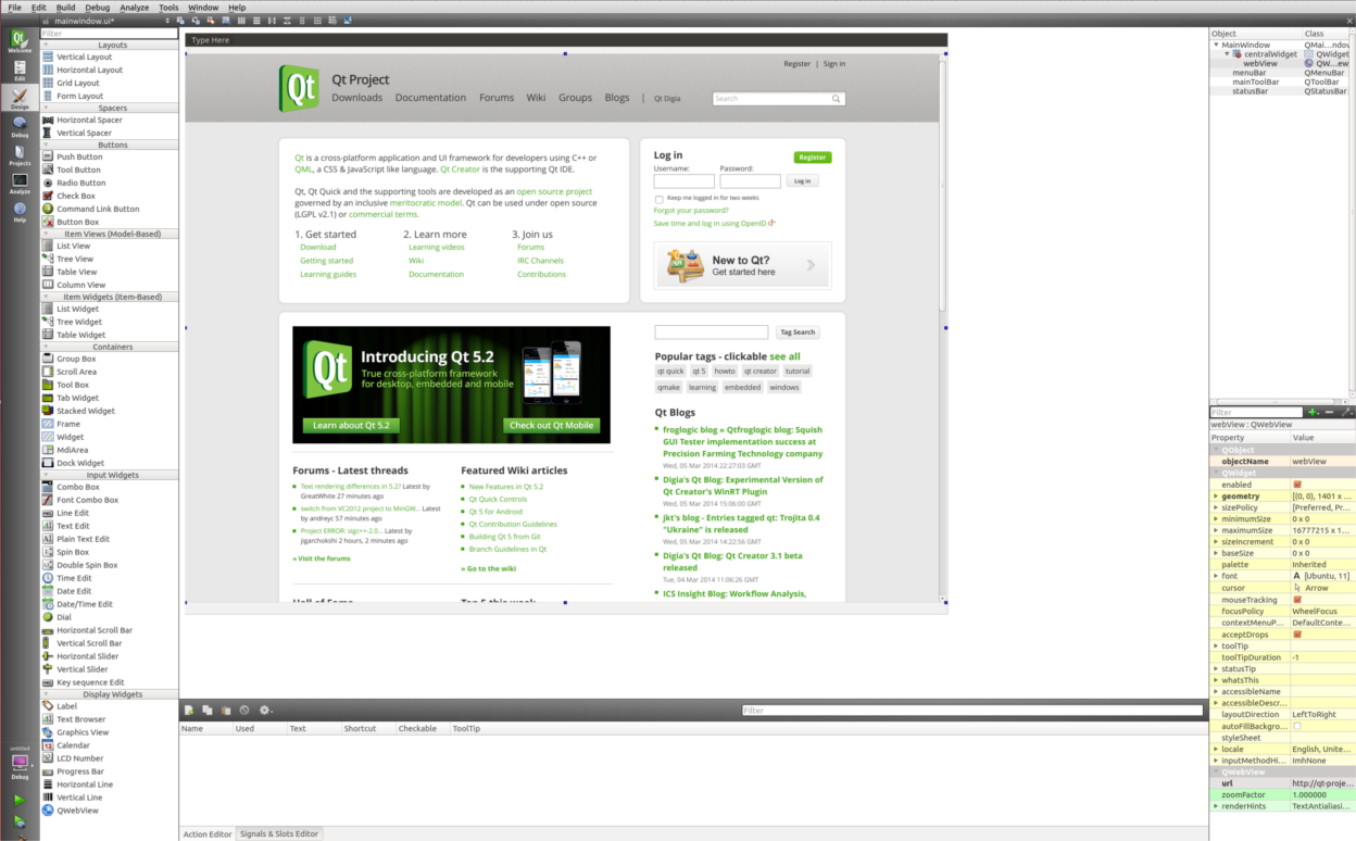 The image below shows QWebView previewed in Qt Creator with the Qt Homepage.