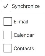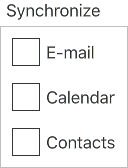 GroupBox { title: qsTr("Synchronize") ColumnLayout { anchors.fill: parent CheckBox { text: qsTr("E-mail") } CheckBox { text: qsTr("Calendar") } CheckBox { text: qsTr("Contacts") } } }