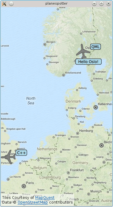 The example shows a map of Europe and airplanes on two routes across Europe. The first airplane commutes between Oslo and Berlin and the second airplane commutes between London and Berlin. The position tracking of each airplane is implemented in C++. The Oslo-Berlin plane is piloted in QML and the London-Berlin plane is commanded by a C++ pilot.