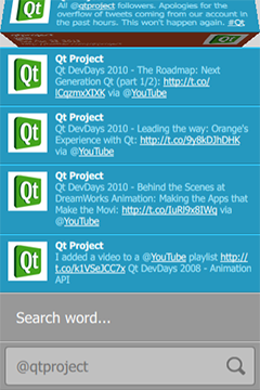 Tweet Search is a QML application that searches items posted to Twitter service using a number of query parameters. Search can be done for tweets from a specified user, a hashtag, or a search phrase.