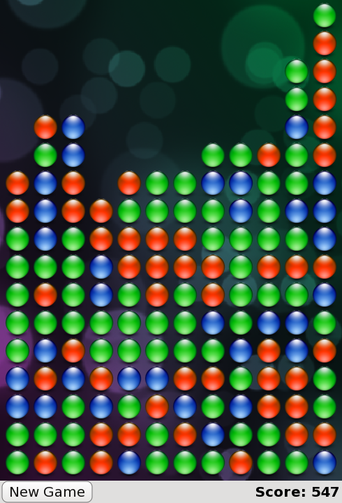 It's not much fun to play Same Game if all the blocks are the same color, so we've modified the createBlock() function in samegame.js to randomly create a different type of block (for either red, green or blue) each time it is called. Block.qml has also changed so that each block contains a different image depending on its type: