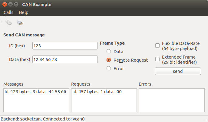 The example sends and receives CAN bus frames. Incoming frames are ordered according to their type. A connect dialog is provided to adjust the CAN Bus connection parameters.