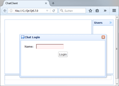 After login, the client can invoke the method sendMessage and receive the signal newMessage to send and receive messages. Furthermore, a userList property provides the names of all other connected clients. The list is automatically updated when its contents change. Also, the client responds to the server's keep alive signal which is needed to detect disconnected clients and remove them from the userList property.
