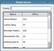 Just as widgets can contain other widgets, layouts can be used to provide different levels of grouping for widgets. Here, we want to display a label alongside a line edit at the top of a window, above a table view showing the results of a query.