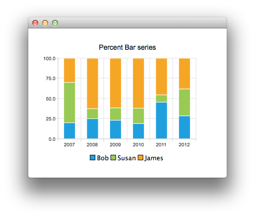 ChartView { title: "Percent Bar series" anchors.fill: parent legend.alignment: Qt.AlignBottom antialiasing: true PercentBarSeries { axisX: BarCategoryAxis { categories: ["2007", "2008", "2009", "2010", "2011", "2012" ] } BarSet { label: "Bob"; values: [2, 2, 3, 4, 5, 6] } BarSet { label: "Susan"; values: [5, 1, 2, 4, 1, 7] } BarSet { label: "James"; values: [3, 5, 8, 13, 5, 8] } } }