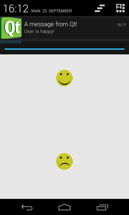 #include <QtAndroidExtras/QAndroidJniObject>We connect the notificationChanged() signal to the updateAndroidNotification() slot to update the notification text when the notification property changes: