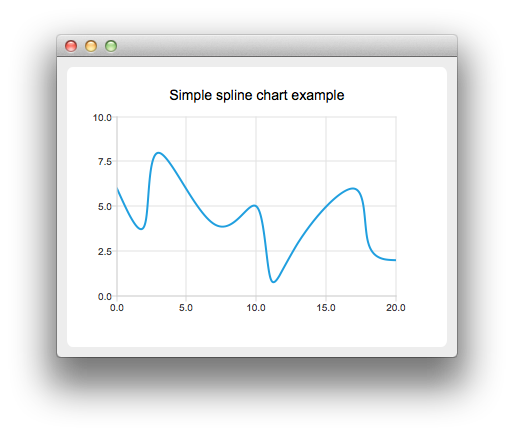 QChart *chart = new QChart(); chart->legend()->hide(); chart->addSeries(series); chart->setTitle("Simple spline chart example"); chart->createDefaultAxes(); chart->axisY()->setRange(0, 10);