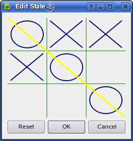 The editState() slot is called whenever the user chooses the Edit State... option in a TicTacToe widget's task menu. The slot creates a TicTacToeDialog presenting the current state of the widget, and allowing the user to edit its state by playing the game.