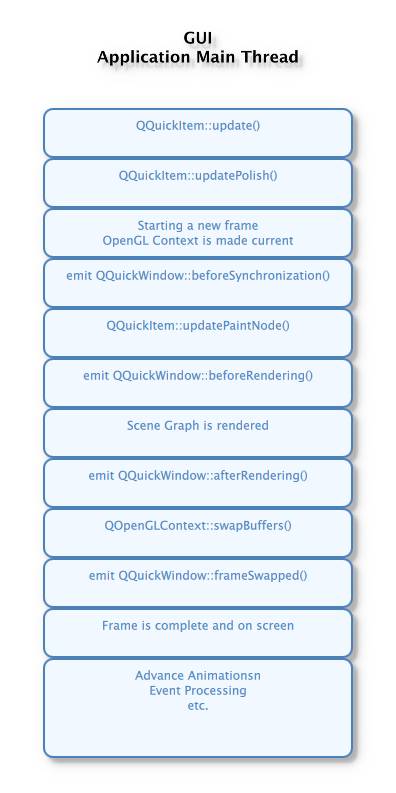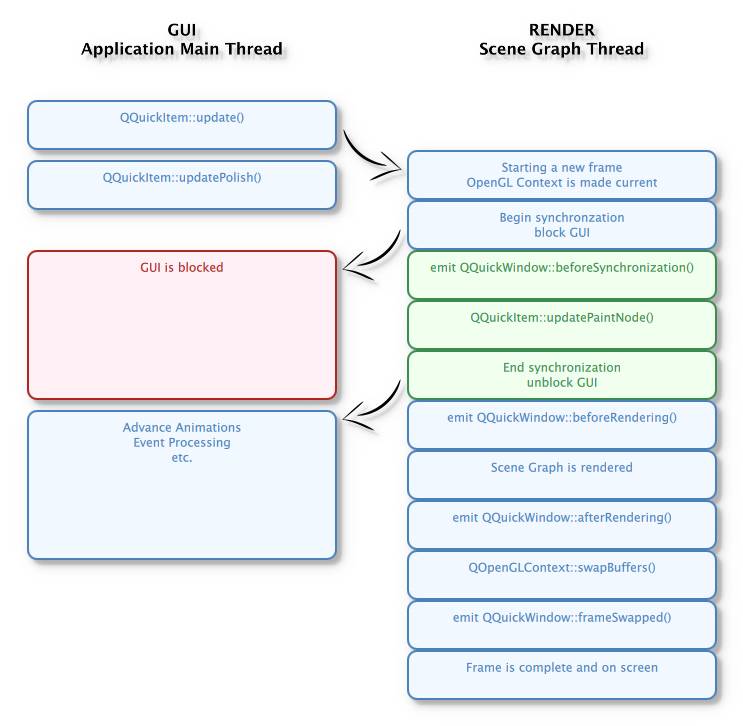 QQuickItem::update()to be called. This can be the result of for instance an animation or user input. An event is posted to the render thread to initiate a new frame. - The render thread prepares to draw a new frame and makes the OpenGL context current and initiates a block on the GUI thread.