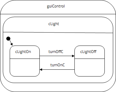 </state>As mentioned before, the guiControl state is always active, and since it is of parallel type, all its direct children are always active too. Therefore, the cLight state is always active. However, only one of its children, cLightOn or cLightOff, is active at a time. The same applies to the other children of the guiControl state. In addition, we define transitions between on and off substates. For example, whenever the active state is cLightOn and a turnOffC event is received, we change the active substate of cLight to cLightOff. Whenever the active state is cLightOff and we receive a turnOnC event, we change the active substate of cLight to cLightOn.