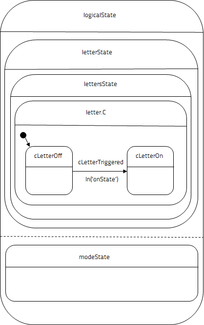 As previously mentioned, logicalState is always active, and since it is of parallel type, the letterState and modeState children are always active too. Now let us look at the first part, the letterState, which contains one parallel lettersState: