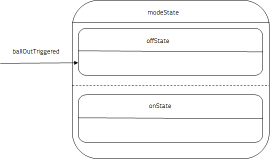 In addition, the onState state defines one transition in reaction to the ballOutTriggered event which instructs the machine to go into the offState. The ballOutTriggered event is expected to be an event posted into the state machine from outside of the state machine. This event should be generated when the ball gets out of playing area of the table. In our example we mimic it by the clicking BALL OUT button. Posting the event from outside of state machine will be shown in the C++ code later on.