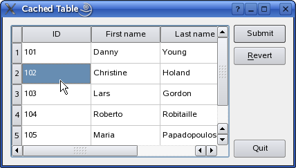 We connect the Quit button to the table editor's close() slot, and the Submit button to our private submit() slot. The latter slot will take care of the data transactions. Finally, we connect the Revert button to our model's revertAll() slot, reverting all pending changes (i.e., restoring the original data).