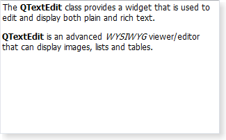 The QTextEdit class provides a widget that is used to edit and display both plain and rich text. |