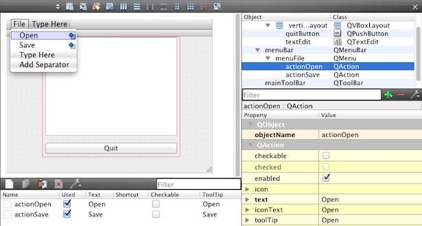 As before, we use Qt Designer to add the widgets to the user interface. The wizard creates an application with a QMenu widget, with the text Type Here as a placeholder for menu and menu item names. Double-click the text to enter names for the File menu and Open and Save menu items. Qt Designer automatically generates the appropriate actions.