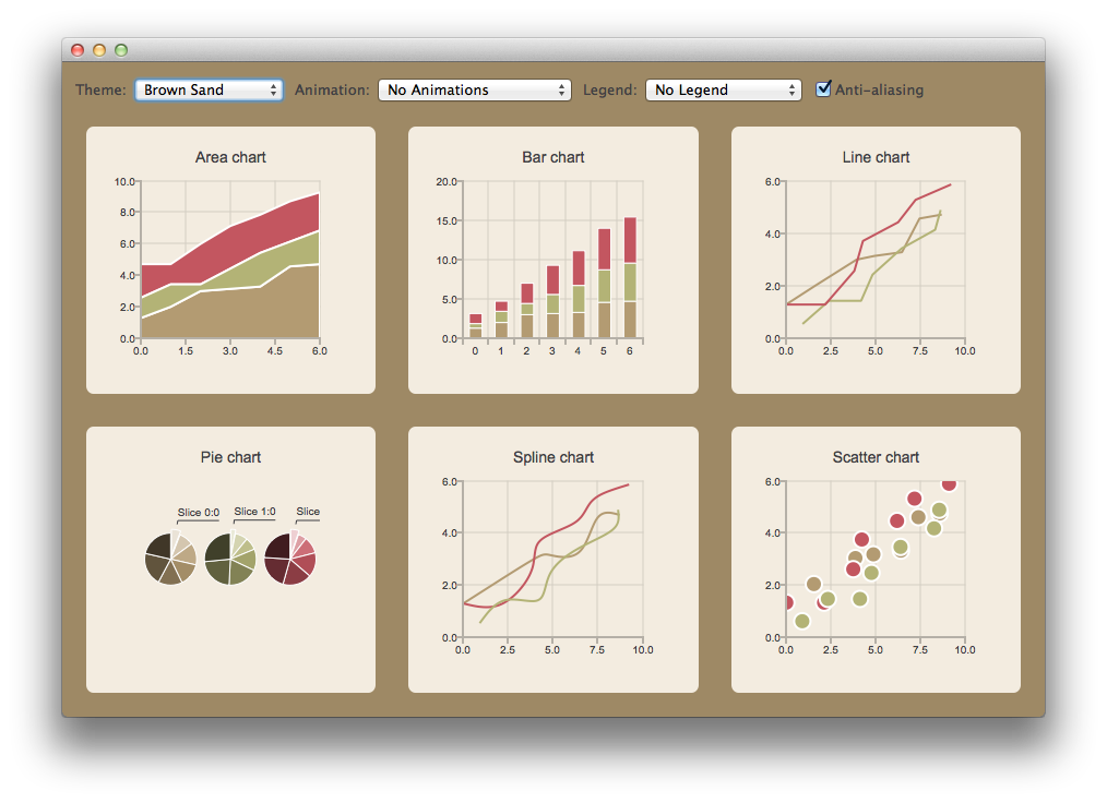 This example shows the look and feel of the different built-in themes for all supported chart types. In order to give the result a more harmonious look, the background palette of the application is customized to the theme selected.