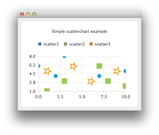 setRenderHint(QPainter::Antialiasing); chart()->addSeries(series0); chart()->addSeries(series1); chart()->addSeries(series2); chart()->setTitle("Simple scatterchart example"); chart()->createDefaultAxes(); chart()->setDropShadowEnabled(false);