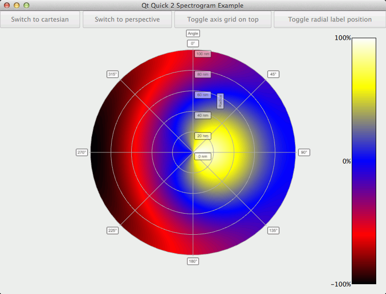 The Qt Quick 2 Spectrogram example demonstrates how to show a polar and cartesian spectrograms and how to utilize orthographic projection to show them in 2D.