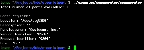 This command line example displays information about serial ports in a console, provided by the class QSerialPortInfo.