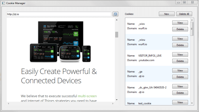 Cookie Browser demonstrates how to use the Qt WebEngine C++ classes to manage cookies. The browser can be used to view cookie content as well as delete cookies and add new cookies.