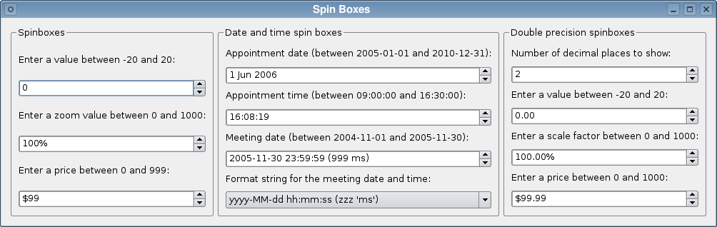 The first spin box shows the simplest way to use QSpinBox. It accepts values from -20 to 20, the current value can be increased or decreased by 1 with either the arrow buttons or Up and Down keys, and the default value is 0.