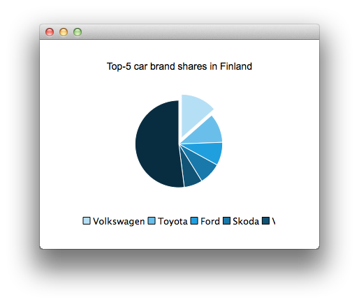 ChartView { id: chart title: "Top-5 car brand shares in Finland" anchors.fill: parent legend.alignment: Qt.AlignBottom antialiasing: true PieSeries { id: pieSeries PieSlice { label: "Volkswagen"; value: 13.5 } PieSlice { label: "Toyota"; value: 10.9 } PieSlice { label: "Ford"; value: 8.6 } PieSlice { label: "Skoda"; value: 8.2 } PieSlice { label: "Volvo"; value: 6.8 } } } Component.onCompleted: { // You can also manipulate slices dynamically othersSlice = pieSeries.append("Others", 52.0); pieSeries.find("Volkswagen").exploded = true; }