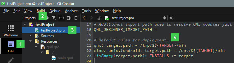 You can see the project's structure by selecting Projects in the sidebar (2). If you select the .pro file (3) under your project, you see its content in the editor view. The last lines in the .pro file (4) define the path where your project is deployed. Qt's project wizard generates the path automatically for Qt Quick projects. For other projects, you need to define the path manually in the project file. For more information, see Deploying Qt Projects with Boot to Qt.