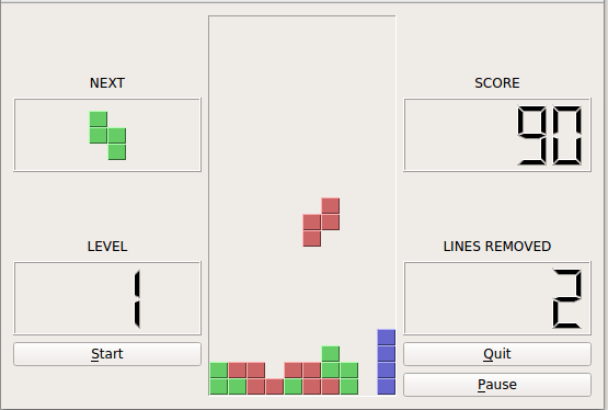 Three QLCDNumber objects are used to display the score, number of lives, and lines removed. These initially show default values, and will be filled in when a game begins: