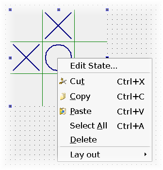 A task menu extension is a collection of QActions. The actions appear as entries in the task menu when the plugin with the specified extension is selected. The image above shows the custom Edit State... action which appears in addition to Qt Designer's default task menu entries: Cut, Copy, Paste etc.