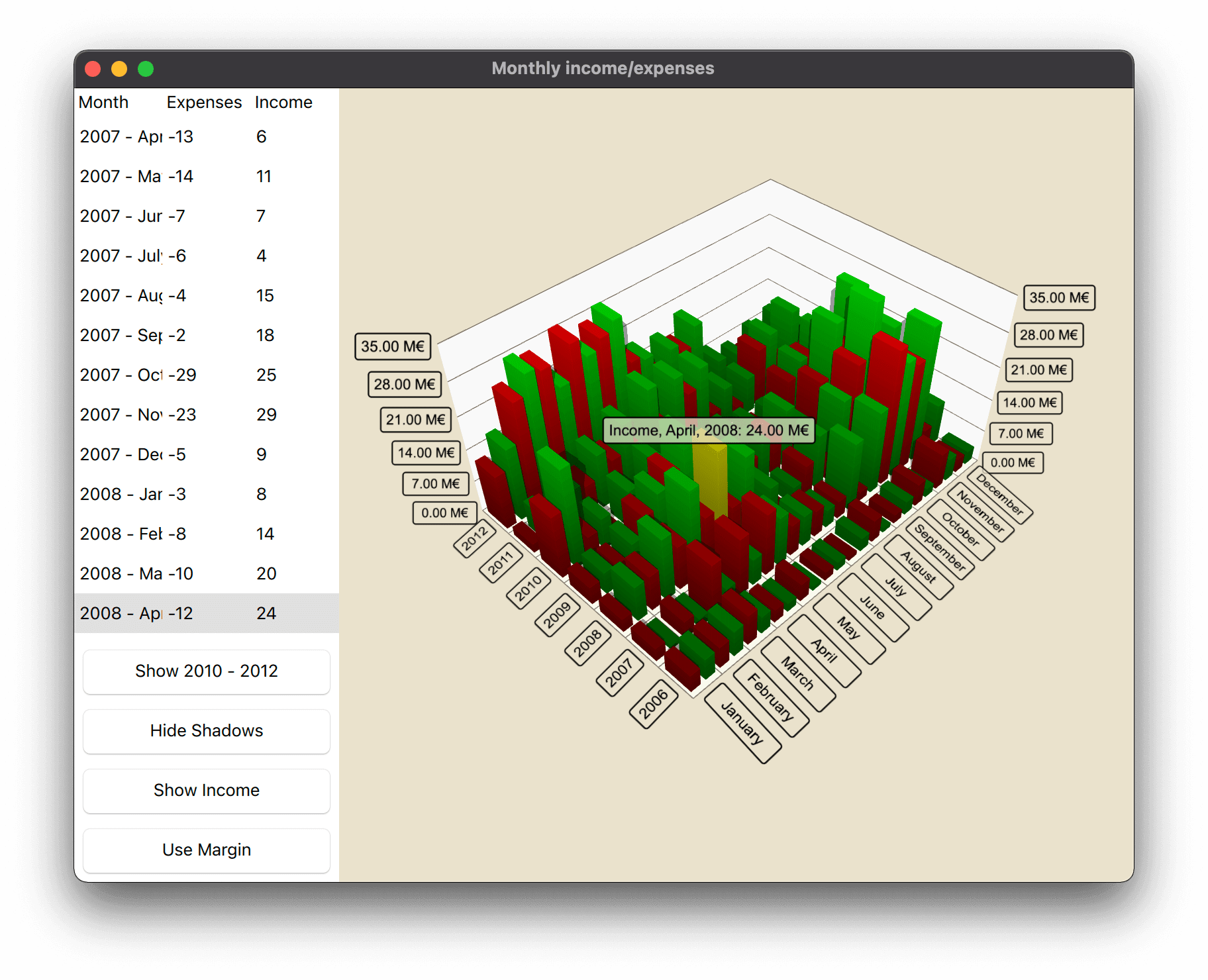 The example data is monthly income and expenses of a fictional company over several years. The data is defined in a list model in Data.qml like this: