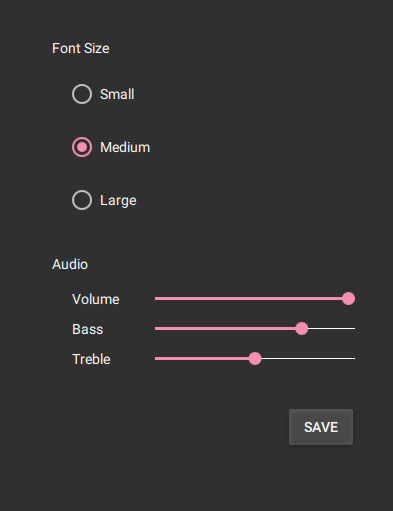 import QtQuick 2.12 import QtQuick.Controls 2.12 import QtQuick.Controls.Material 2.12 ApplicationWindow { visible: true Material.theme: Material.Dark Material.accent: Material.Purple Column { anchors.centerIn: parent RadioButton { text: qsTr("Small") } RadioButton { text: qsTr("Medium"); checked: true } RadioButton { text: qsTr("Large") } } } |