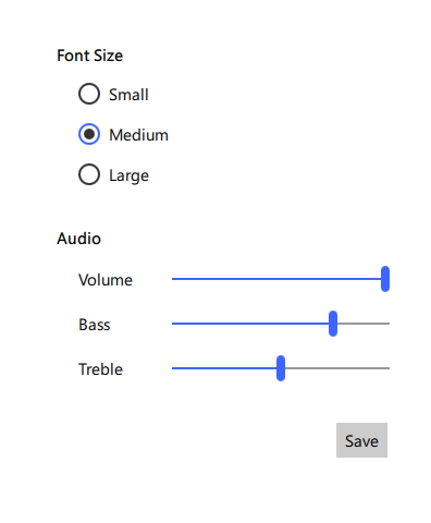 import QtQuick 2.12 import QtQuick.Controls 2.12 import QtQuick.Controls.Universal 2.12 ApplicationWindow { visible: true Universal.theme: Universal.Dark Universal.accent: Universal.Violet Column { anchors.centerIn: parent RadioButton { text: qsTr("Small") } RadioButton { text: qsTr("Medium"); checked: true } RadioButton { text: qsTr("Large") } } } |