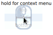 Grab on press: exclusive | On press, TapHandler takes the exclusive grab; after that, the eventPoint can be dragged within the bounds of the parent item, while the timeHeld property keeps counting, and the longPressed() signal will be emitted regardless of drag distance. However, like WithinBounds, if the point leaves the bounds, the tap gesture is canceled(), active() becomes false, and timeHeld stops counting. This is suitable for implementing press-drag-release components, such as menus, in which a single TapHandler detects press, timeHeld drives an "opening" animation, and then the user can drag to a menu item and release, while never leaving the bounds of the parent scene containing the menu. This value was added in Qt 6.3.TapHandler { id: menuPopupHandler gesturePolicy: TapHandler.DragWithinBounds onPressedChanged: if (pressed) { menu.x = point.position.x - menu.width / 2 menu.y = point.position.y - menu.height / 2 } else { feedback.text = menu.highlightedMenuItem selectFlash.start() } onCanceled: feedback.text = "canceled" } |