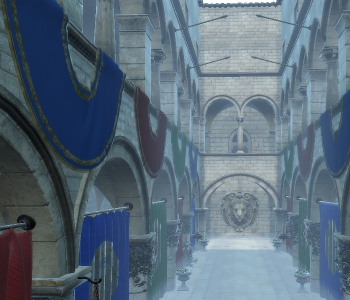 Note: The scene, including the camera and the models, are expected to be set up accordingly, so that sensible ranges can be defined by properties such as depthNear and depthFar. Do not expect that fog can always be enabled on a scene containing assets imported as-is, without tuning the transforms first. For example, the example screenshots on this page with the Sponza model are generated after manually applying an additional scale of (100, 100, 100) on the instantiated Sponza component that was generated by the balsam tool from the glTF source asset. This then gave a sufficient Z range to get good looking results by tuning the depthNear and depthFar values.