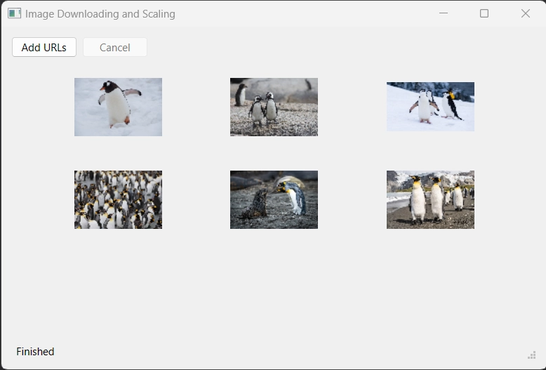 ...After clearing the possible leftovers from previous download, we create a dialog so that the user can specify the URLs for the images to download. Based on the specified URL count, we initialize the layout where the images will be shown and start the download. The future returned by the download() method is saved, so that the user can cancel the download if needed: