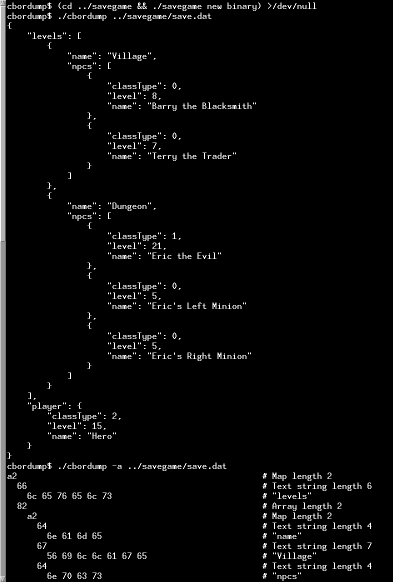 This example shows how to use the QCborStreamReader class directly to parse CBOR content. The cbordump program reads content in CBOR format from files or standard input and dumps the decoded content to stdout in a human-readable format. It can output in CBOR diagnostic notation (which is similar to JSON), or it can produce a verbose output where each byte input is displayed with its encoding beside it.