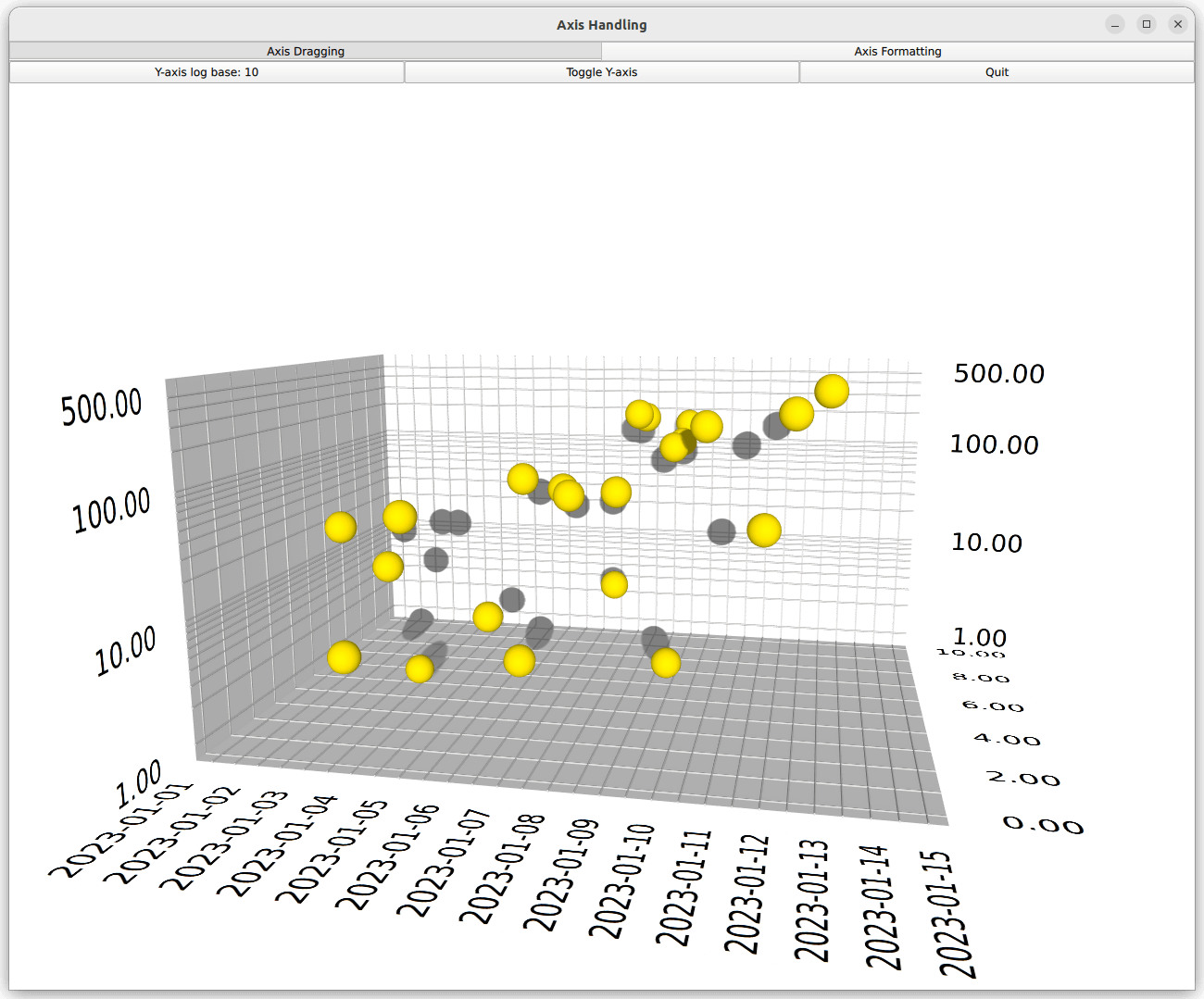ValueAxis3D { id: logAxis formatter: LogValueAxis3DFormatter { id: logAxisFormatter base: 10 autoSubGrid: true showEdgeLabels: true } labelFormat: "%.2f" }