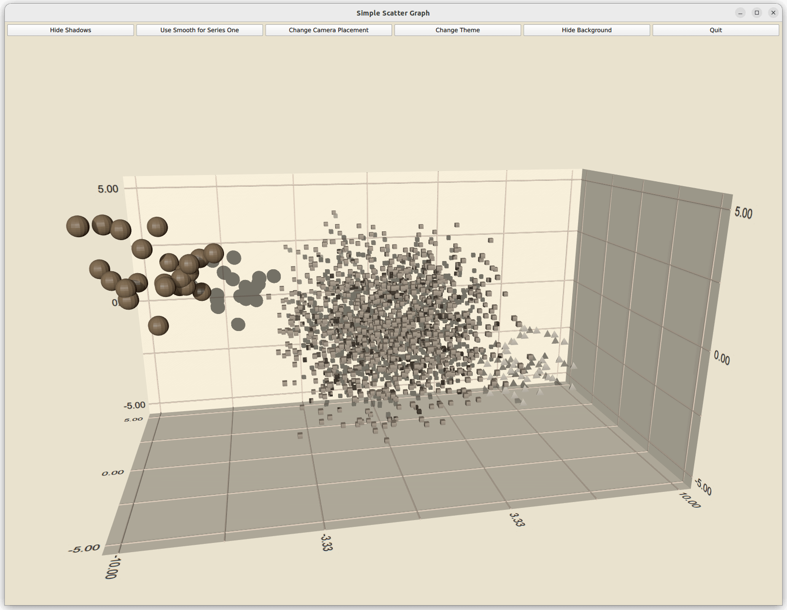 Scatter3DSeries { id: scatterSeriesTwo itemLabelFormat: "Series 2: X:@xLabel Y:@yLabel Z:@zLabel" itemSize: 0.05 mesh: Abstract3DSeries.MeshCube ...