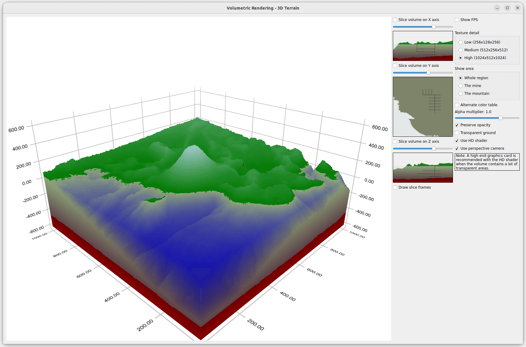 Sometimes, viewing just the slices doesn't give you a good understanding of the volume's internal structure. QCustom3DVolume provides two properties that can be used to adjust the volume transparency: